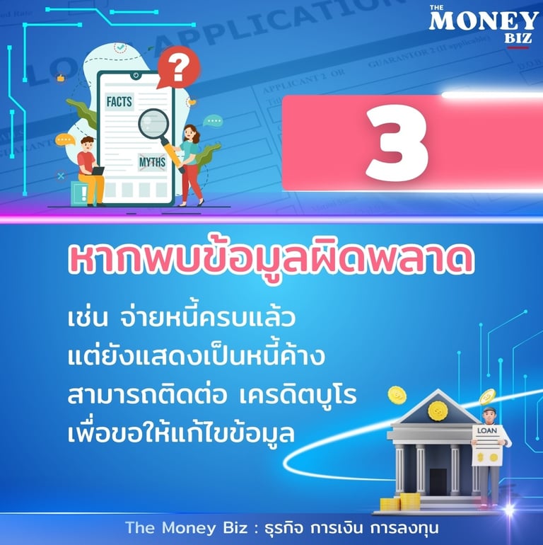 3. หากพบข้อมูลผิดพลาด เช่น จ่ายหนี้ครบแล้ว แต่ยังแสดงเป็นหนี้ค้าง สามารถติดต่อ เครดิตบูโร เพื่อขอให้แก้ไขข้อมูล